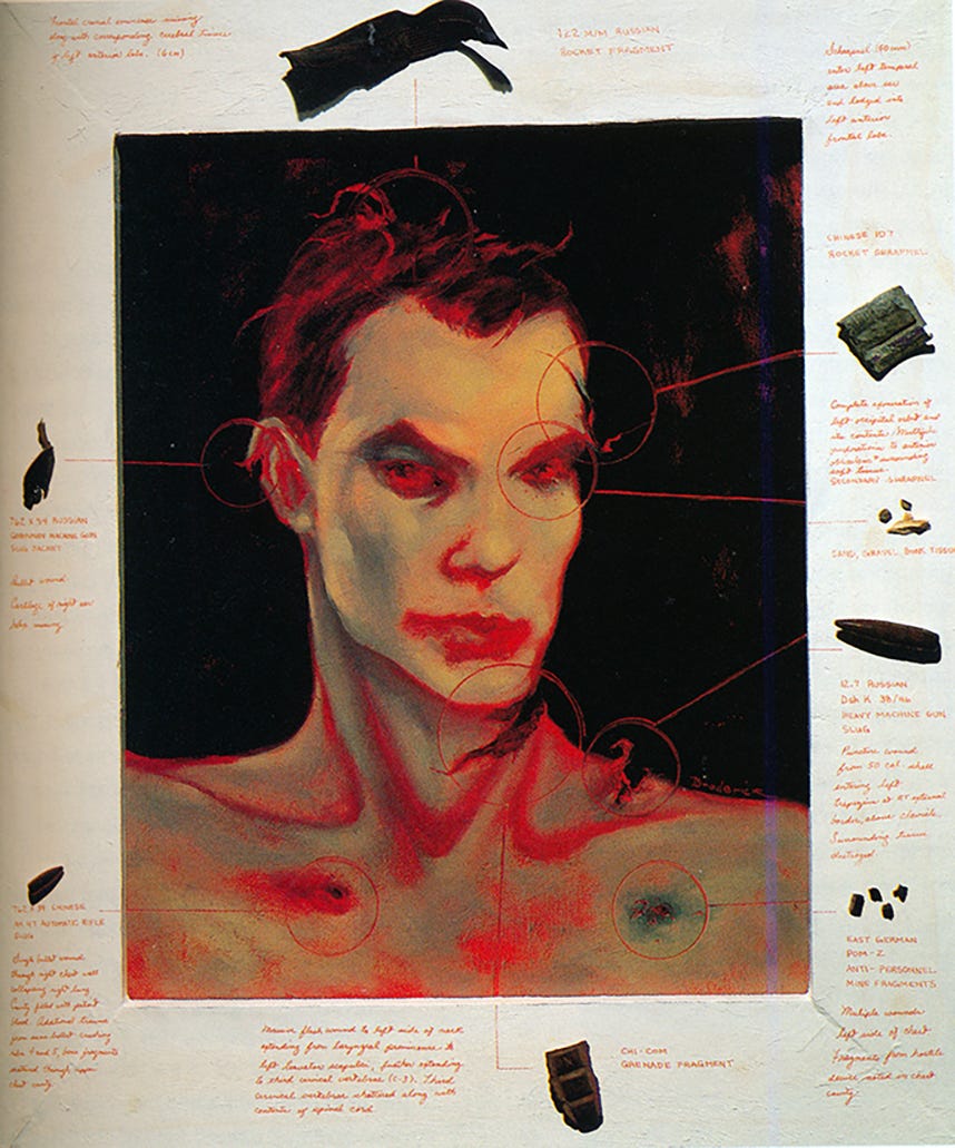 We have notable exceptions, of course: Oliver Stone served in the 25th Infantry Division for a tour and bore witness to these experiences with the 1986 film Platoon. There are numerous other American military from the period who have made works that are as compelling in their depiction of war and its consequences, but in media that are less accessible in both their availability and in their precise content. Many Vietnam vets would utilize creative media with more porous boundaries than that of film, using their wartime experiences as a canvas upon which to paint visceral, yet not intellectually simplistic, portraits of the human condition. Among these, perhaps only Kim Jones has received much recognition from the official Art World’s biennales, and even then only after staging his notorious 1976 “Rat Piece” in imitation of the sadistic rituals he had witnessed “in country”. The catalog documenting Reflexes and Reflections, the initial exhibit of the National Vietnam Veterans’ Art Museum (now simply the National Veterans’ Art Museum), does indeed feature Jones, and also introduces many artists whose work is trenchant in its commentary, and aesthetically engaging, without being a product of the formal art education intended to instill such qualities.